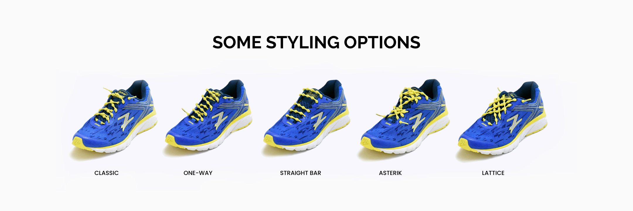 Non-tying active laces with patented elastic technology that provides adjustable tension between shoe eyelets. Premium laces designed to enhance a broad range of shoes.